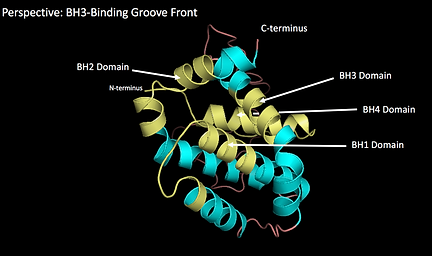 Bcl-2 contains 5 conserved domains that can be found in all members of the anti-apoptotic Bcl-2 family: Bcl-2 Homology (BH) domains 1-4 and a transmembrane domain located at the C-terminus. In addition to the conserved domains, the protein consists of 7 alpha helices, where the two central predominantly hydrophobic helices (helix 5 and 6) are wrapped around 4 amphipathic helices (see animation above). The active side of Bcl-2 is formed by alpha helices 2, 3, 4, 5 and 7. It is a hydrophobic groove on the surface called BH3-binding groove (also called the hydrophobic groove).